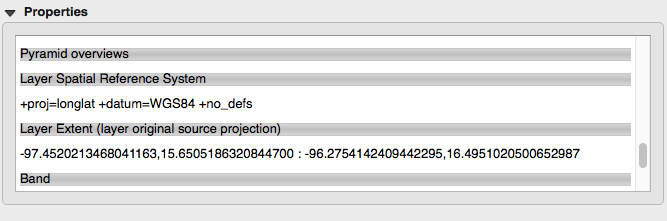 Muchas veces es necesario realizar un cambio de proyección de la información descargada. En este caso la información descargada de INEGI se encuentra en coordenadas geográficas (longlat) y en el elipsoide WGS84. Esto se puede ver haciendo clic secundario sobre la raster (en el Panel lateral) y seleccionar Propiedades, luego ir a la pestaña de Metadatos, como se muestra en la figura siguiente.