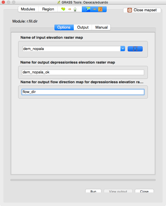 Para llenar los datos del MDE con información válida se utiliza la herramienta r.fill.dir cuya ventana principal se muestra en la figura. Ésta herramienta realiza un filtrado y genera un MDE sin falsas depresiones y un mapa de dirección de flujo a partir de una capa raster de elevaciones.