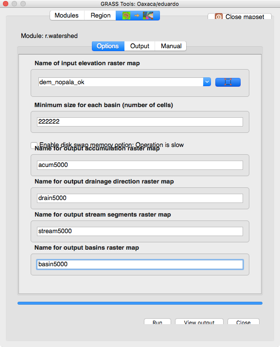r.watershed elevation=dem_nopala_ok@eduardo threshold=222222 accumulation=acum5000 drainage=drain5000 stream=stream5000 basin=basin5000