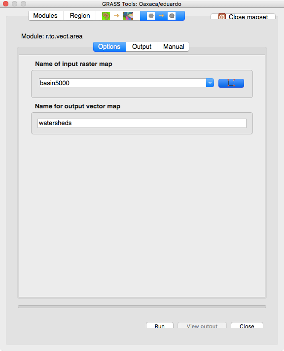 Para manejar de una forma más práctica la delimitación de las cuencas, se convierte la capa con la delimitación de las cuecas (a la que se llamó basin) de datos raster a vectores. Para hacer la conversión hay que abrir las herramientas de GRASS y hacer clic en la pestaña Lista de módulos en la que hay que seleccionar r.to.vect.area el cual sirve para convertir un archivo raster a vectores, en este caso a polígonos. La ventana de diálogo correspondiente a este módulo se muestra en la figura. Al terminar la ejecución de la instrucción, se obtiene un archivo en formato vector con la delimitación de las cuencas como polígonos.