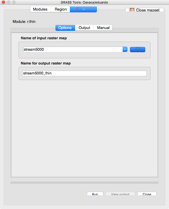 Para generar corrientes superficiales en formato de líneas se utiliza la capa raster de corrientes (a la que se llamó stream) generada al principio del análisis. Para convertir esta capa raster a vector es necesario procesarla primero con la herramienta r.thin como se muestra en la imagen.
