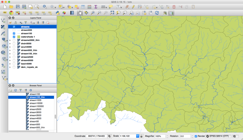 Se pueden hacer varias ejecuciones del análisis con el módulo r.watershed usando diferentes valores del tamaño de cuenca con la finalidad de obtener escurrimientos a detalle. En este caso se realizó la conversión a vector de los escurrimientos obtenidos a 100 y 500 ha.
