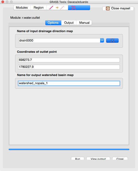 Desde la ventana de diálogo de las herramientas de GRASS se usa el módulo r.water.outlet como se puede ver en la figura.